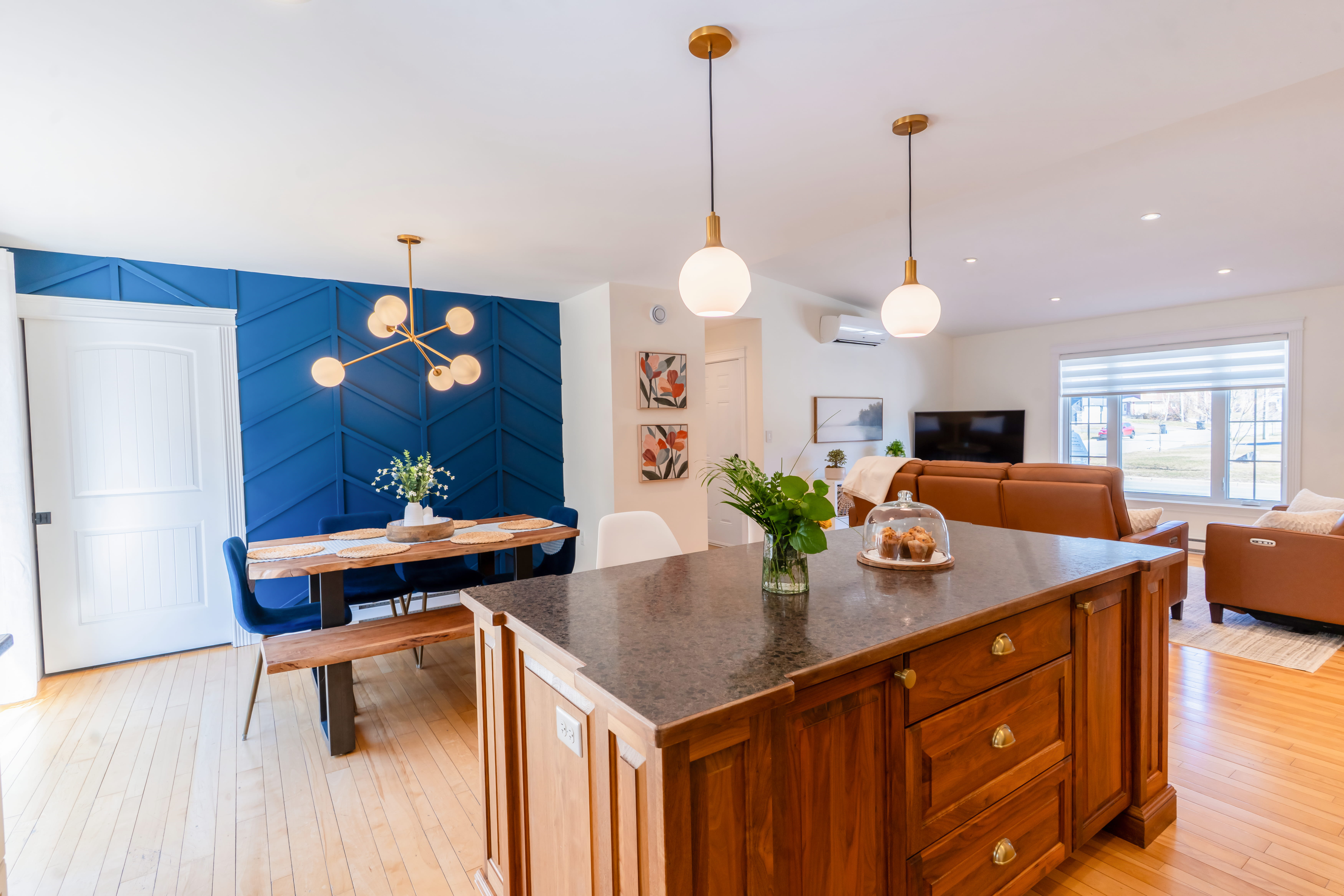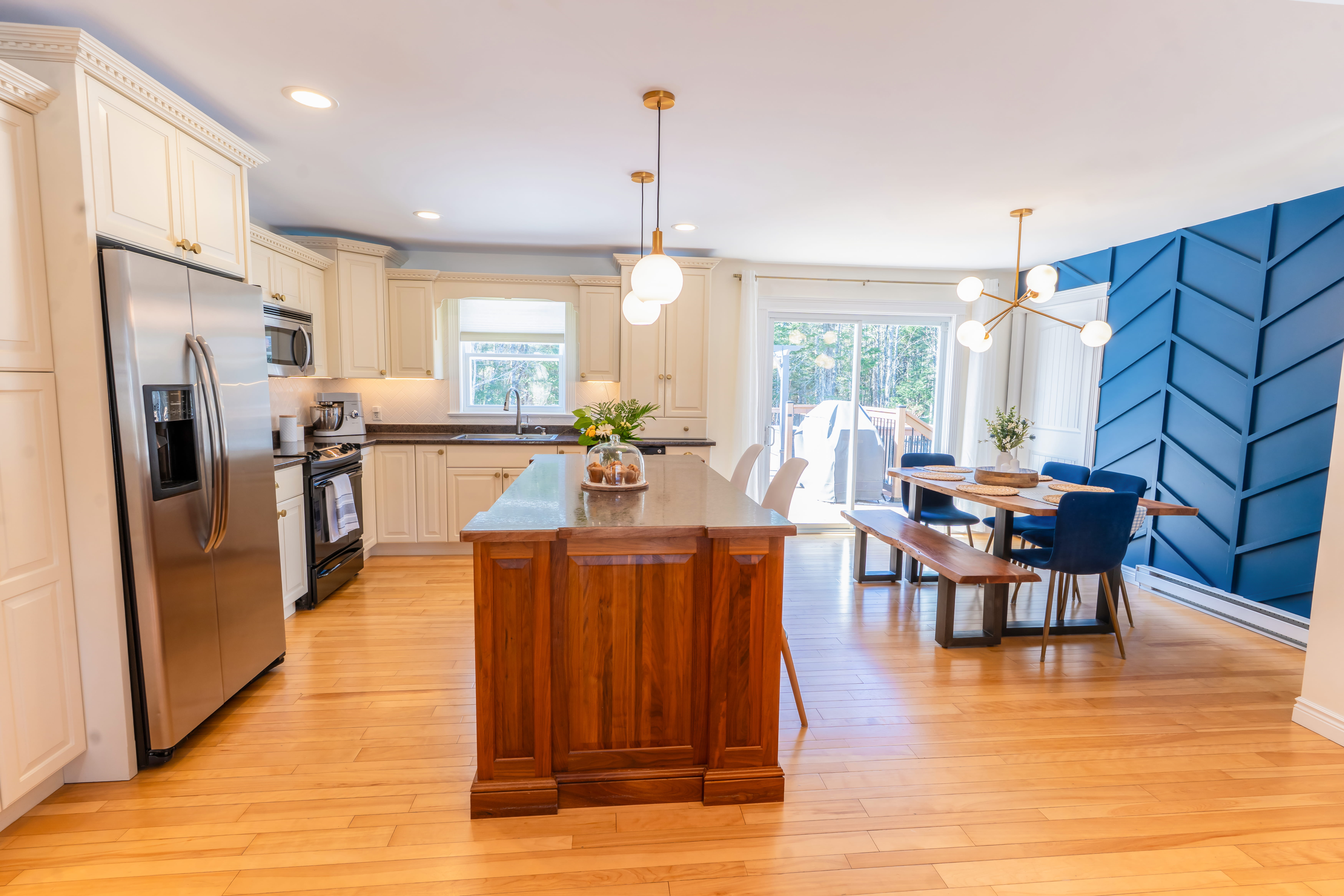Next is the kitchen - a true centerpiece - featuring custom cream cabinetry with stylish gold hardware, a large walnut island, a herringbone backsplash, and stainless steel appliances including a double-sink setup. Adjacent to the kitchen, the dining area shines with a beautiful accent wall, modern light fixtures, a handy laundry space, and patio doors leading to a massive two-tier deck complete with an 18' heated saltwater pool — perfect for summertime relaxation.